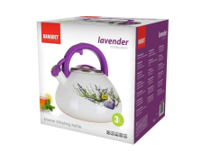 Smaltovaný čajník dekor Levandule s nerezovou pokličkou. Sklopná píšťalka. Plastové ucho ve fialové barvě. Fialový plastový hmatník. Objem: 3l. Barva: bílá/barevný dekor. Vhodný na indukci.