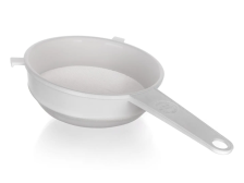 Plastový cedník Praktis s dlouhou rukojetí. Otvor na zavěšení. Velmi jemné síto. Průměr: 16 cm. Barva: bílá.