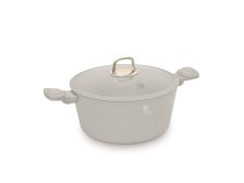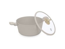 Hliníkový hrnec SAHARA se skleněnou poklicí. Třívrstvý nepřilnavý povlak titanPro. Ergonomické rukojeti Soft Touch Stay Cool. Poklice z tvrzeného skla se silikonovým vylévacím okrajem. Rozměry: 28 x 12,4 cm. Objem: 6,1l. Barva: matná krémová/zlaté prvky.