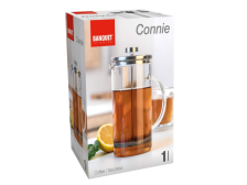 Skleněný kávovar CONNIE s nerezovým filtračním pístem. Materiál: borosilikátové sklo/nerez 18/8. Rozměry: 19 x 9 cm. Objem: 1l. Barva: čirá/stříbrná.