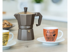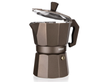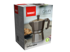 Kávovar Campi na 6 šálků kávy. Hliníkové tělo, bezpečnostní ventil, plastové otevřené madlo a hmatník. Rozměry: 9,3 x 19 cm. Objem: 260 ml. Barva: hnědá. Vhodný na plynové, elektrické a sklokeramické deskách. Nevhodný do myčky nádobí a na indukci.