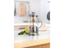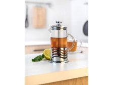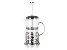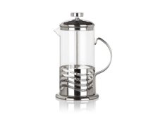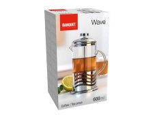 Skleněná konvička Wave s nerezovým sítkem na kávu nebo sypaný čaj. Nerezový stojan. Sklo je určeno na horké nápoje do +100°C. Výborně napění teplé mléko do kávy nebo dětské kakao. Materiál: sklo/nerez/plast. Objem: 600 ml. Barva: čirá/stříbrný stojan.