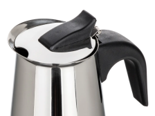 Nerezový kávovar Kitchisimo Cafeteria pro 6 šálků. Plastové otevřené ucho. Rozměry: Ø 9 x 20 cm. Objem: 300 ml. Barva: stříbrná/černý plast. Vhodný na indukci.