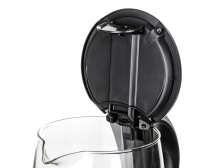 Skleněná rychlovarná konvice MADDIE. Ploché dno. Tlačítko zapnutí/vypnutí na rukojeti. Odměrná stupnice na skle. Ochrana proti přehřátí, základna se středovým konektorem/otočná o 360°. Příkon: 1370 - 1630 W. Objem: 1,2 litru. Barva: stříbrná/černý plast.