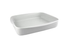 Keramická zapékací miska MAILA obdélníkového tvaru s žebrovaným designem. Postranní rukojeti pro pohodlné uchopení. Ideální i jako servírovací mísa. Odolné do trouby do teploty 240°C. Rozměry: 33,5 x 16 x 6 cm. Barva: bílá.