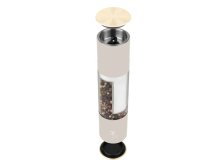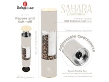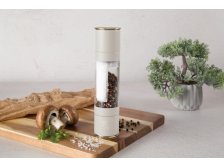 Mechanický mlýnek na pepř a sůl 2v1 Sahara Collection. Keramický mlecí mechanismus. Dvoukomorový průhledný plastový zásobník. Nerezové tělo. Výška: 22,3 cm. Barva: matná krémová sahara/zlaté prvky.