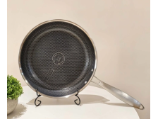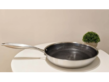 Celonerezová pánev Kitchisimo s nepřilnavým plástvovým povrchem. Nýtovaná rukojeť. Možnost zavěšení. Max. teplota: +260°C. Rozměry: 24 x 5 cm. Barva: stříbrná/vnitřní černá. Vhodná na indukci a do myčky nádobí.