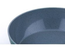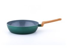 Pánev hluboká Pure z kovaného hliníku. Třívrstvý šedý keramický nepřilnavý povlak s jemnými zelenými tečkami. Ergonomická měkčená rukojeť v imitaci dřeva. Rozměry: 28 x 8 cm. Barva: zeleno-šedá. Vhodná na indukci.
