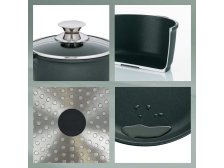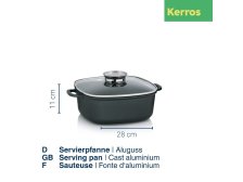 Čtvercový pekáč Kerros s uchy. Skleněná poklice s nerezovým dochucovacím víčkem. Tělo z tlakově litého hliníku/vnitřní nepřilnavý keramický povrch GREBLON C3+. Rozměry: 28 x 28 cm/výška 11 cm. Objem: 6l. Barva: černá. Vhodný na indukci.