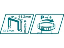 Sponkovací pistole Total. Sešívačka s nastavitelnou silou. Železná konstrukce. Určena pro sponky 11,3 mm/délky 4-14 mm. Barva: zeleno-šedá.