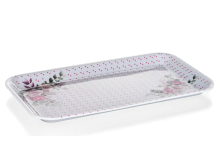 Plastový podnos Rose. Obdélníkový tvar. Materiál: melamin. Rozměry: 29,5 x 16,5 x 1,5 cm. Barva: bílo-růžová/barevný dekor. Nevhodný do myčky. Nádobí z melaminové pryskyřice je velmi odolné.