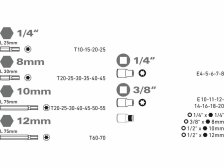 - hroty hroty 1/4"x25mm: T10-15-20-25, hroty 8mm(5/16")x30mm: T20-25-30-35-40-45, hroty 10x75mm: T20-25-30-40-45-50-55, hroty 12x75mm: T60-70