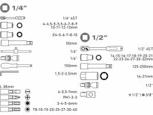 - hlavice nástrčné 1/4": 4-4,5-5-5,5-6-7-8-9-10-11-12-13mm, E4-5-6-7-8-10, 1/2": 14-15-16-17-18-19-20-21-22-23-24-27-30-32mm