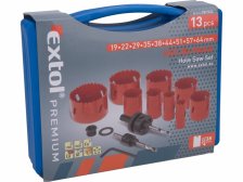 Vrtáky korunkové, univerzální Extol Premium. Plastový kufr. Použití: dřevo, plasty, sádrokarton, cihla, barevné a lehké kovy, ocel, litina, nerez. Materiál: HSS/Bi-metal. Průměry: 19-64 mm/9 průměrů. Max. hloubka vrtu: 38 mm. Sada: 13 ks.