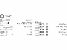 - hlavice zástrčné 1/4: (-) 4-5,5-7mm, PH1-2-3, PZ1-2, H3-4, T15-20