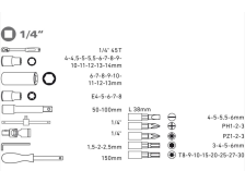 - hlavice zástrčné 1/4": (-) 4-5-5,5-6, PH1-2-3, PZ1-2-3, HEX3-4-5-6, T8-9-10-15-20-25-27-30