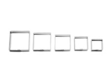 Sada vykrajovaček tvar Čtverec. Materiál: zdravotně nezávadný pocínovaný plech. Různé rozměry/výška pásku: 16 mm. Sada: 5 ks. Barva: stříbrná.