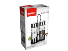 Slánka a pepřenka z čirého skla v nerezovém stojánku s úchytem pro přenášení. Snadná údržba, vhodná do myčky na nádobí. Rozměry: 3 x 8,9 cm. Objem menážky: 40 ml. Barva: stříbrná.