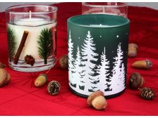 Vonná svíčka ve skle vánoční motiv Vánoční stromek. Rozměry: 8 x 9 cm. Hmotnost: 206g. Barva: bílo-zelená. Aroma: borový les.