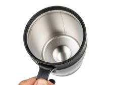 Nerezový termohrnek COFFE s černým potiskem. Plastové víčko s uzavíratelným pítkem a silikonovým těsněním. Dvojitá stěna hrnku s vakuovou izolací. Protiskluzové dno. Objem: 450 ml. Barva: stříbrná/černý plast.