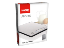 Digitální nerezová kuchyňská váha Akcent. LCD displej. Funkce dovažování TARE. Max. nosnost: 5 kg. Rozměry: 19,9 x 15,4 cm. Napájení: 2 x 1,5V AAA baterie (nejsou součástí výrobku). Barva: stříbrná/černý rámeček.